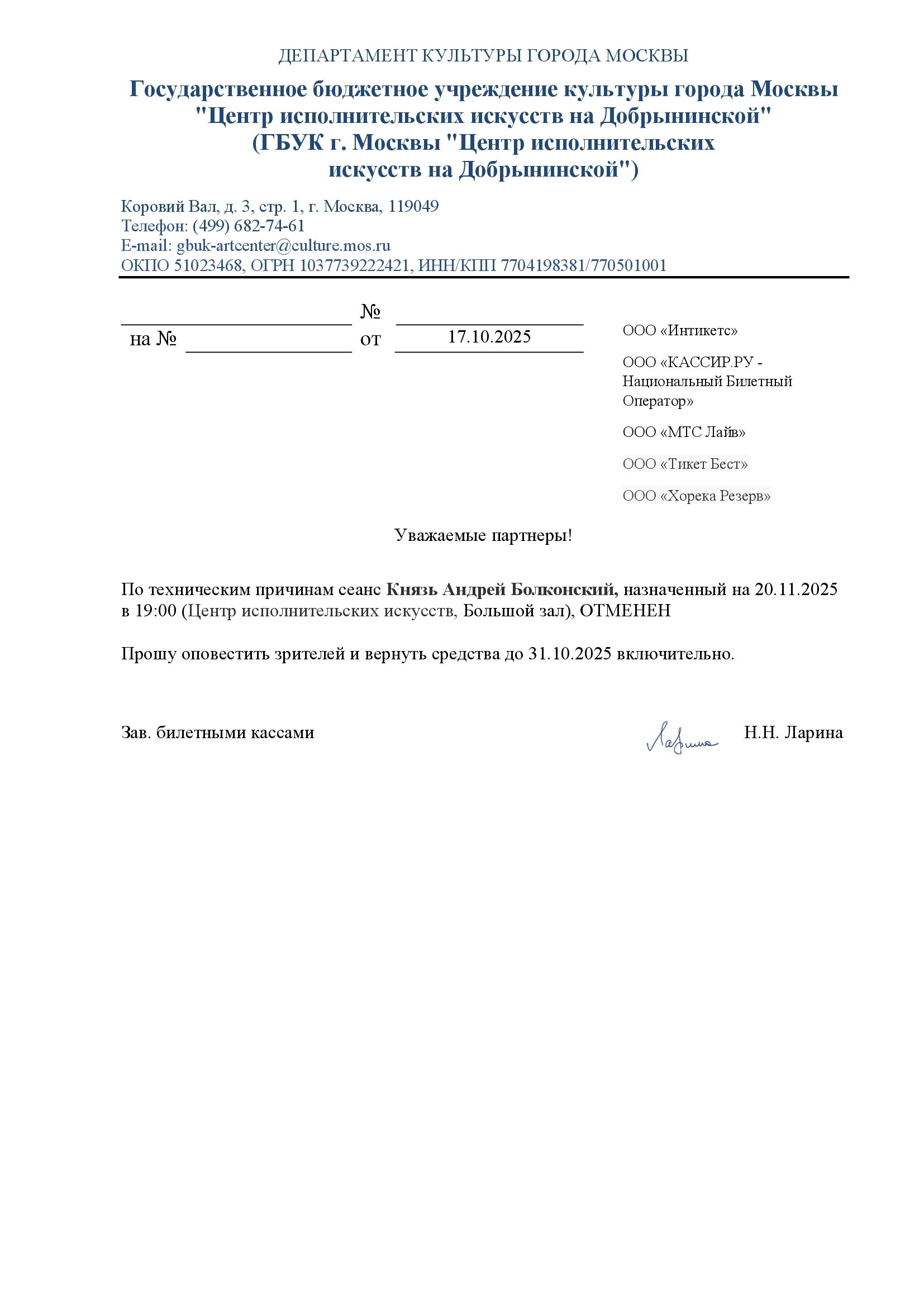 Уважаемый клиент! Спешим сообщить, что по информации, полученной от организатора, спектакль «Князь Андрей Болконский», запланированный на 20 ноября 2025 года в 19:00 в центре исполнительских искусств, отменён. Деньги за электронные билеты вернутся автоматически в полном объёме на карту, с которой была произведена оплата. Если вы купили билет в кассе Ticketland.ru за наличный расчет, то обратитесь, пожалуйста, на почту: vozvrat@ticketland.ru. С уважением, команда поддержки Ticketland