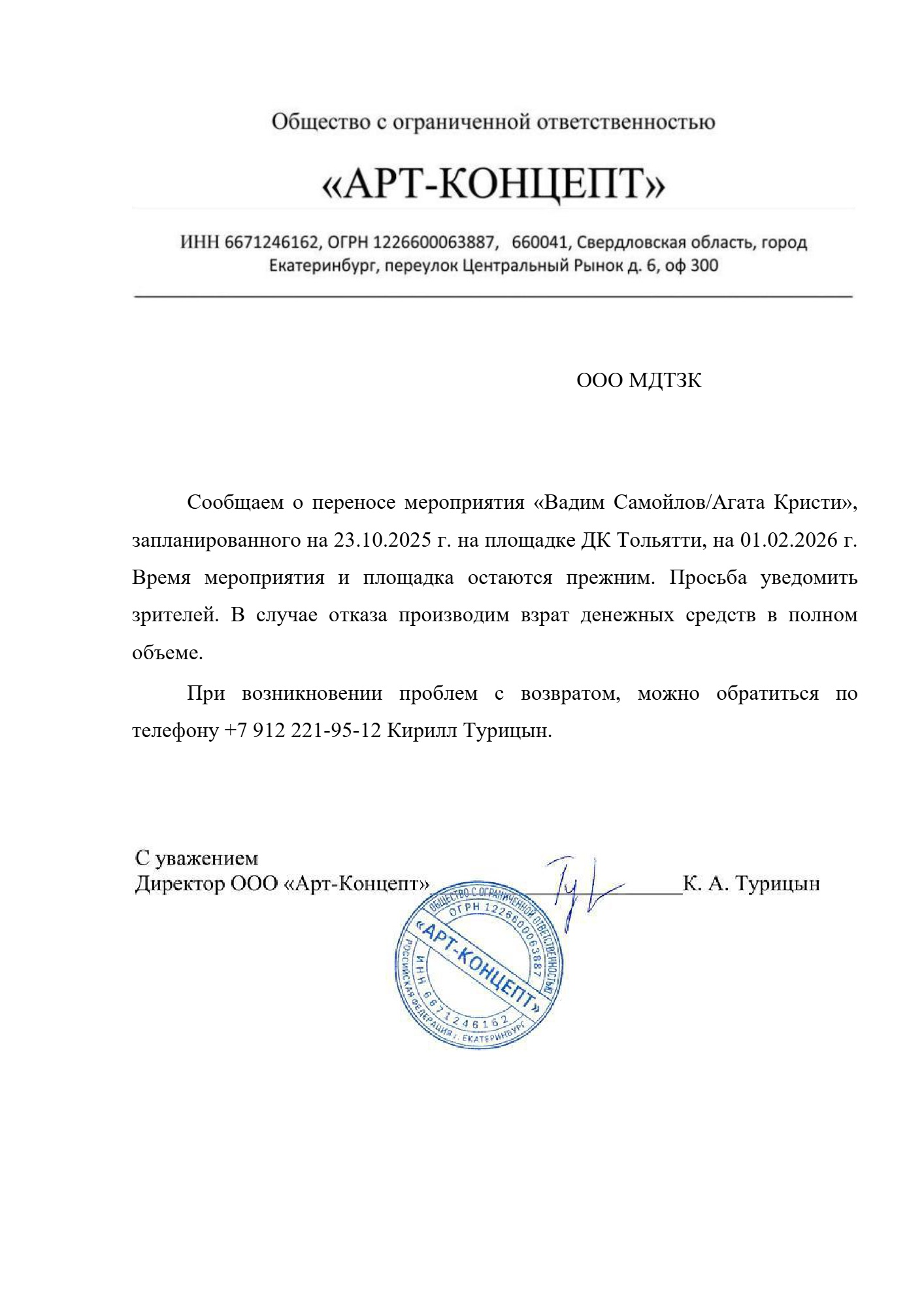 Уважаемый клиент! Спешим сообщить, что по информации, полученной от организатора, концерт «Вадим Самойлов. Группа «Агата Кристи», запланированный на 23 октября 2025 года в 19:00 в ДК «Тольятти» имени Абрамова, перенесён на 1 февраля 2026 года, начало в 19:00. Ранее приобретенные билеты действительны на новую дату, обменивать их не нужно. Если вам не удобно посетить спектакль в новую дату, вы можете вернуть билет по кнопке в личном кабинете во вкладке «Заказы» (до 01.02.2026 19:00). Деньги за электронные билеты вернутся автоматически в полном объёме на карту, с которой была произведена оплата. Если вы купили билет в кассе Ticketland.ru за наличный расчет, то обратитесь, пожалуйста, на почту: vozvrat@ticketland.ru. С уважением, команда поддержки Ticketland.