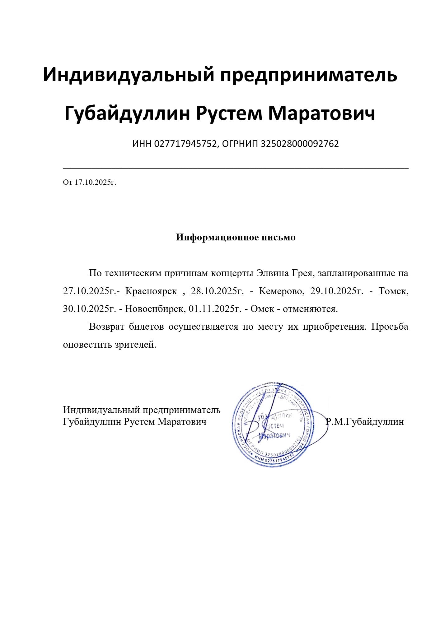 Уважаемый клиент! Спешим сообщить, что по информации, полученной от организатора, концерт Элвина Грея, запланированный на 28 октября 2025 года в 19:00 в Кемеровском Дворце молодежи, отменён. Деньги за электронные билеты вернутся автоматически в полном объёме на карту, с которой была произведена оплата. Если вы купили билет в кассе Ticketland.ru за наличный расчет, то обратитесь, пожалуйста, на почту: vozvrat@ticketland.ru. С уважением, команда поддержки Ticketland